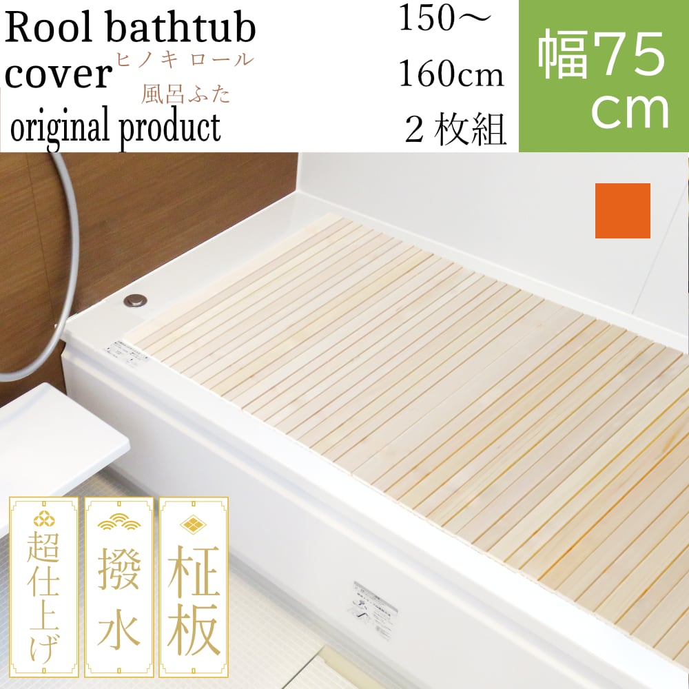 ヒノキ ロール 風呂ふた 撥水塗装 幅75cm 送料無料 受注生産 冷めにくい 長さ150〜160cm(選択式) x 厚み約8mm 巻き 組み合わせ 桧 ひのき 蓋 木製 フタ 保温 檜
